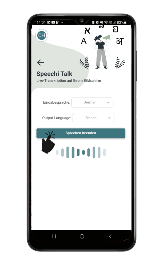 Klicken Sie auf „Mit dem Sprechen beginnen“ und sprechen Sie in das Mikrofon Ihres Geräts (im Beispiel: Smartphone). Oben auf dem interaktiven Whiteboard sehen Sie dann die Transkription in der gewählten Ausgabesprache.