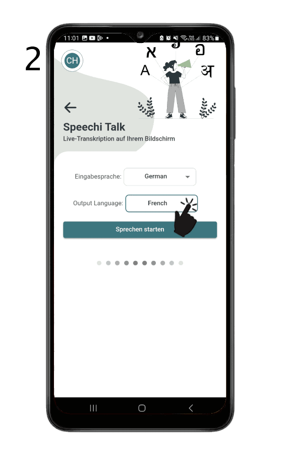 Bevor Sie direkt mit dem Unterricht beginnen, gibt es einen Zwischenschritt, der nur wenige Sekunden dauert. Im Menü Ihrer Speechi-Connect-App klicken Sie auf die Schaltfläche Speechi Talk, nehmen die zwei geforderten Einstellungen vor und beginnen dann, in das Mikrofon Ihres Geräts* zu sprechen.