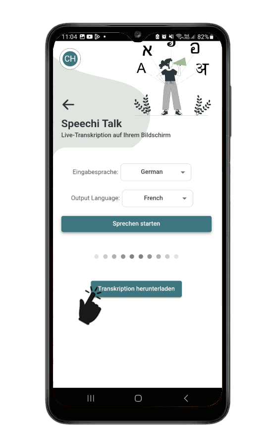 Auf dem oberen Teil des interaktiven Whiteboards erscheint dann die Transkription Ihrer Worte in der Sprache Ihres mehrsprachigen Schülers. Am Ende des Unterrichts, wenn Sie Speechi Talk beenden, können Sie ein Dokument herunterladen, in dem Ihre Rede in Ihrer Sprache transkribiert ist. Sie können dieses Dokument Ihrem Schüler unverändert zur Verfügung stellen – oder es zuvor bearbeiten.