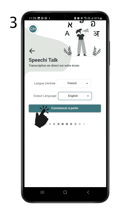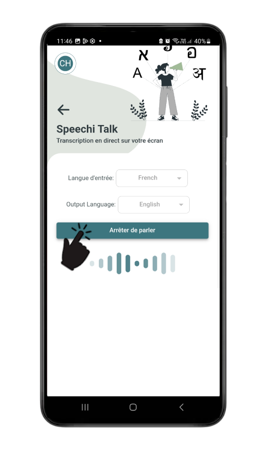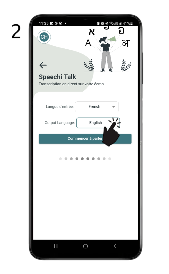 Avant de commencer d’emblée votre cours, vous allez procéder à une étape intermédiaire qui ne prend que quelques secondes. Dans le menu de votre application Speechi Connect, vous allez cliquer sur le bouton Speechi Talk, faire les 2 réglages demandés, puis commencer à parler au micro de votre appareil*.