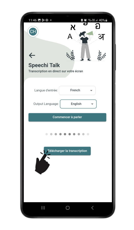 S’affiche alors sur la partie supérieure de l’ENI la retranscription de vos paroles dans la langue de votre élève allophone. A la fin du cours, quand vous mettez fin à Speechi Talk, vous pouvez télécharger un document dans lequel est retranscrite votre prise de parole dans votre langue. Libre à vous de la fournir telle quelle à l’élève, ou bien de la modifier.