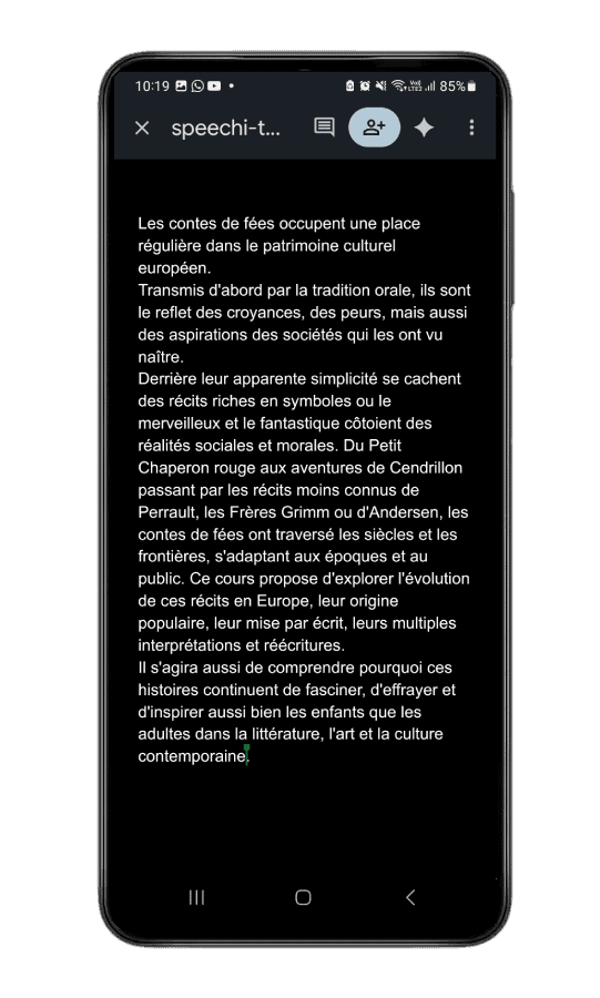 Cliquez sur « Commencer à parler », puis parlez au micro de votre appareil (ici est donné l’exemple du smartphone). Vous verrez alors s’afficher en haut de l’écran interactif la transcription dans la langue de sortie choisie.